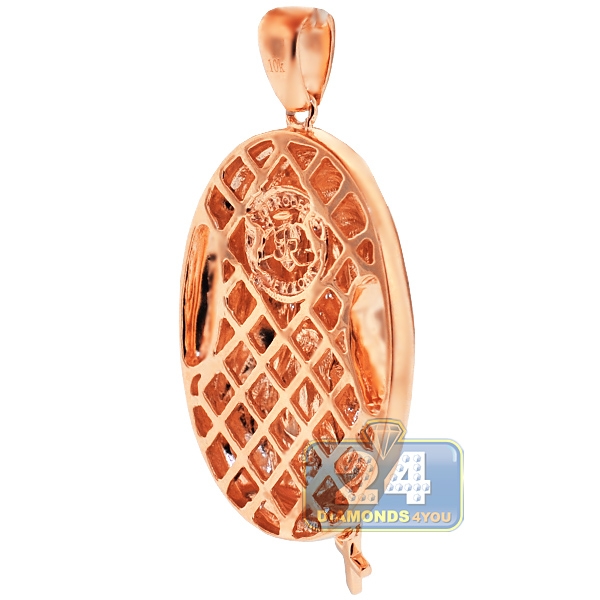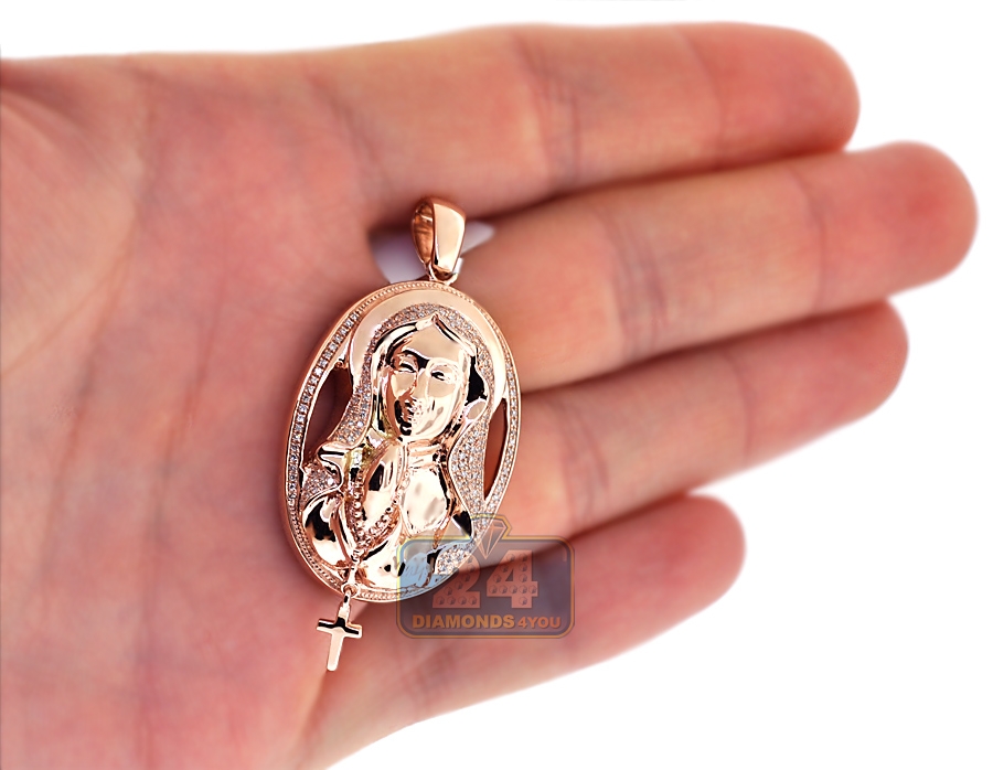 Make a stylish statement of faith wearing this diamond Virgin Mary pendant! Professionally made of hot 10k rose gold, and precisely polished for very sparkling smooth touch. The piece is accented with 0.64 carat of icy white round brilliant-cut genuine diamonds (SI1-SI2 clarity, G-H color). Our men's diamond pendant measures 45 mm in total height and 25 mm in width. The diamond religious pendant is full of splendor and peace!