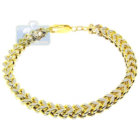 Versatile and rich looking, our gold Franco bracelet will make a classic statement! It's lovely crafted in solid 10 karat yellow gold, and has highly polished smooth finish with sparkling diamond cut accents which covered with white rhodium. This men's gold bracelet has length of 9 inches, width of 6 mm and weight of 20.5 grams. It's also secured by user-friendly lobster claw. Complete your look with this hypnotizing real gold bracelet!