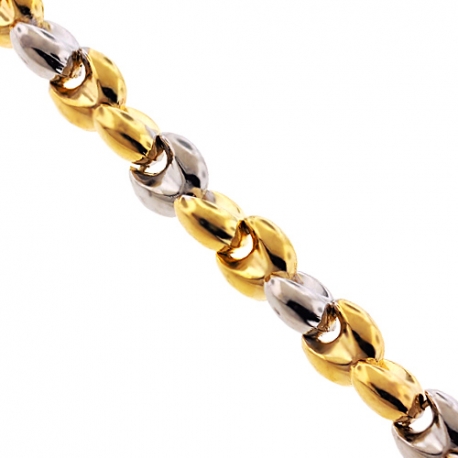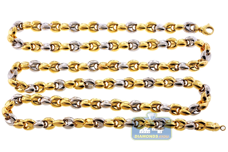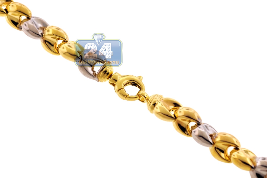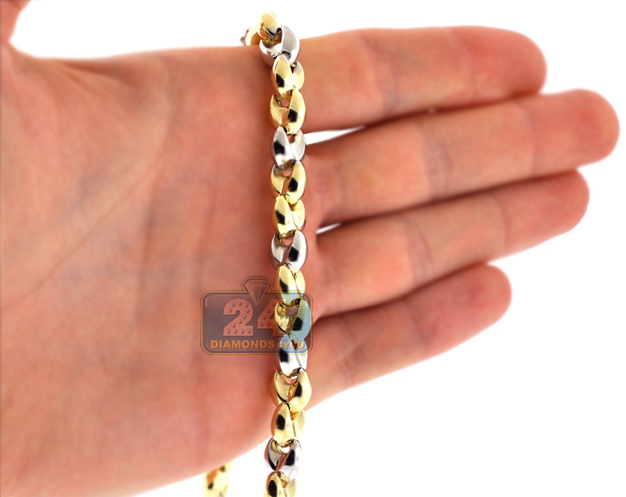 Unique style of our puffed bullet link necklace catches the eye right away! Professionally crafted in Italian 10k gold of yellow and white tones, it's highly polished for brilliant finish. The two tone gold chain measures 8.5 mm in width, available in 30 or 36 inches in length, and secured with comfortable and secure lobster claw closure. This men's gold chain will be your new favorite piece of jewelry!