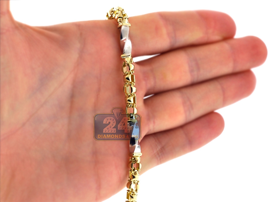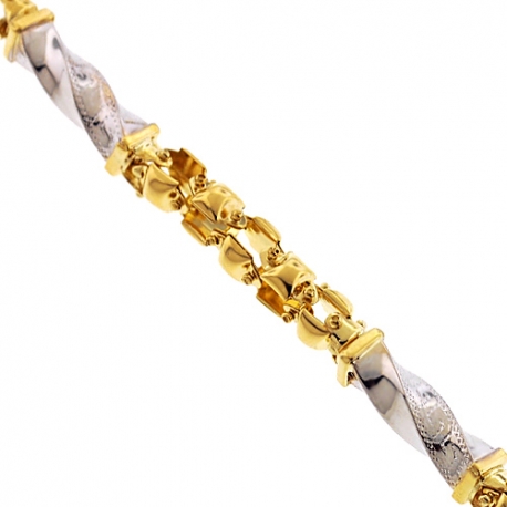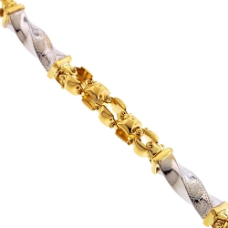 Classic style meets abstract imagination in our impressive swirl bullet link necklace! Artfully crafted in Italian 10k gold of yellow and white tones, it's high-polished for shimmering finish. The two tone gold chain measures 6 mm in width, and available in length of 26, 28, 30 or 36 inches. The weight varies from 35 to 48 grams. It's secured by the safest lobster claw clasp. Wear this superb men's gold chain by day or night!