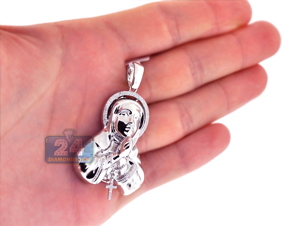 Our Virgin Mary cross pendant is a special symbol of faith! It's professionally made of lustrous 10k white gold, and high-polished for very smooth feel. The religious pendant is amazed with 0.33 carat of gleaming white round brilliant-cut genuine diamonds, SI1-SI2 clarity, G-H color. This men's diamond pendant has total height of 51 mm and width of 31 mm. Let your faith shine with this tremendous diamond religious pendant!