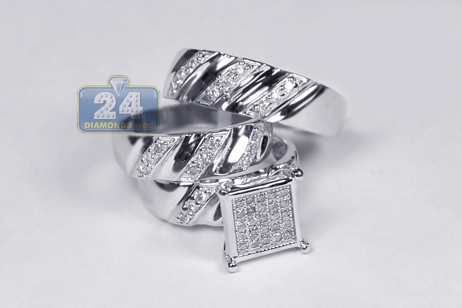 Glamorous but affordable, our diamond bridal three rings set makes a fashionable statement! It consists of an engagement ring, and two wedding bands for bride and groom. All of them are made of cool 10k white gold, and encrusted with white round-cut genuine diamonds totaling 0.70 carat. Complete your happy wedding day with this outstanding wedding 3-piece set!