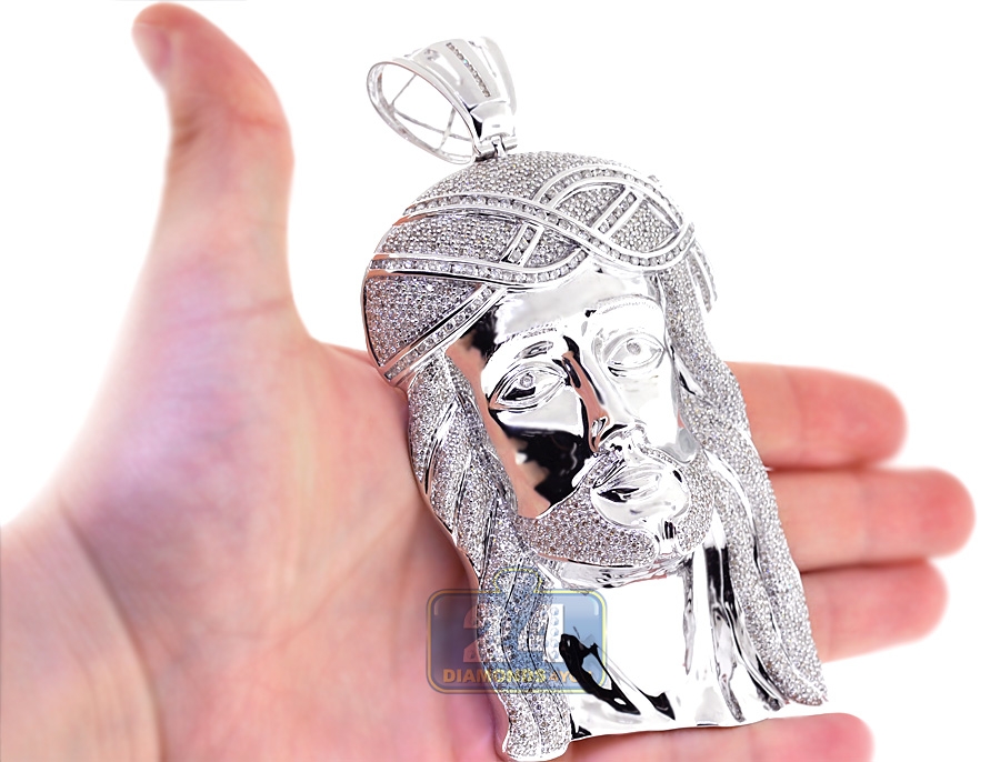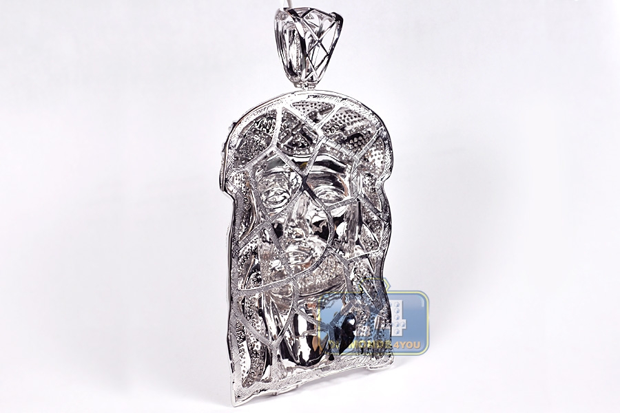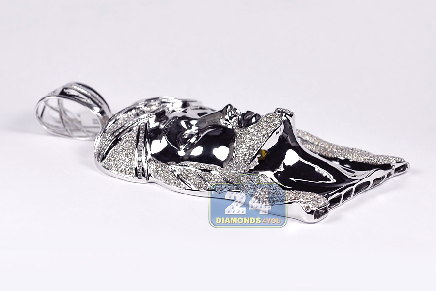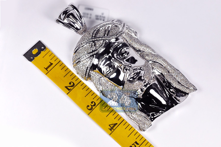 Flaunt your faith with this Jesus Christ diamond pendant! Professionally handmade of solid 10 karat white gold, it has highly polished ultra sparkling finish. Our men'w religious pendant is decorated with heap of icy white round brilliant-cut diamonds totaling 13.04 carats (SI1-SI2 clarity, G-H color). This large Jesus pendant measures 5.5 inches in length and 2.5 inches in width. Show your spiritual devotion with a religious diamond pendant!