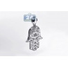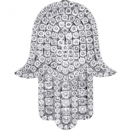 Traditional spiritual symbol with a lovely contemporary design comes in this Hamsa Hand of God pendant! Finely created from cool 10k white gold, it's highly polished for smooth and shiny finish. Our men's Hamsa pendant is paved with icy white round brilliant-cut genuine diamonds, total weight is 2.14 carats. The piece of jewelry has dangling length of 40 mm, and the hand is 29 x 23 mm. The bail fits a chain of up to 2.5 mm in width. This delicate Hand of God pendant for men will be an extraordinary gift!