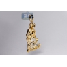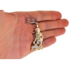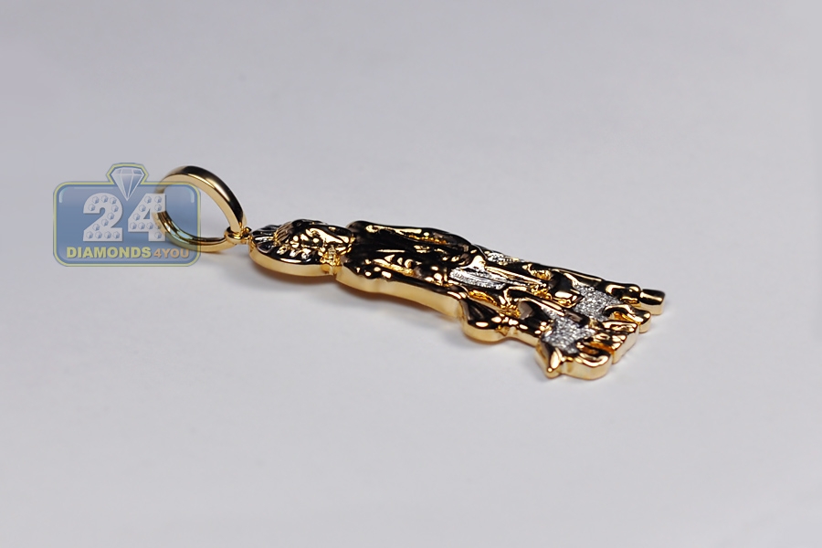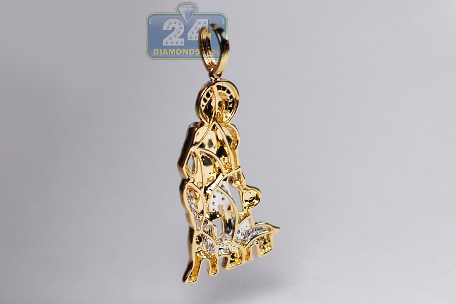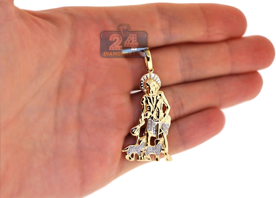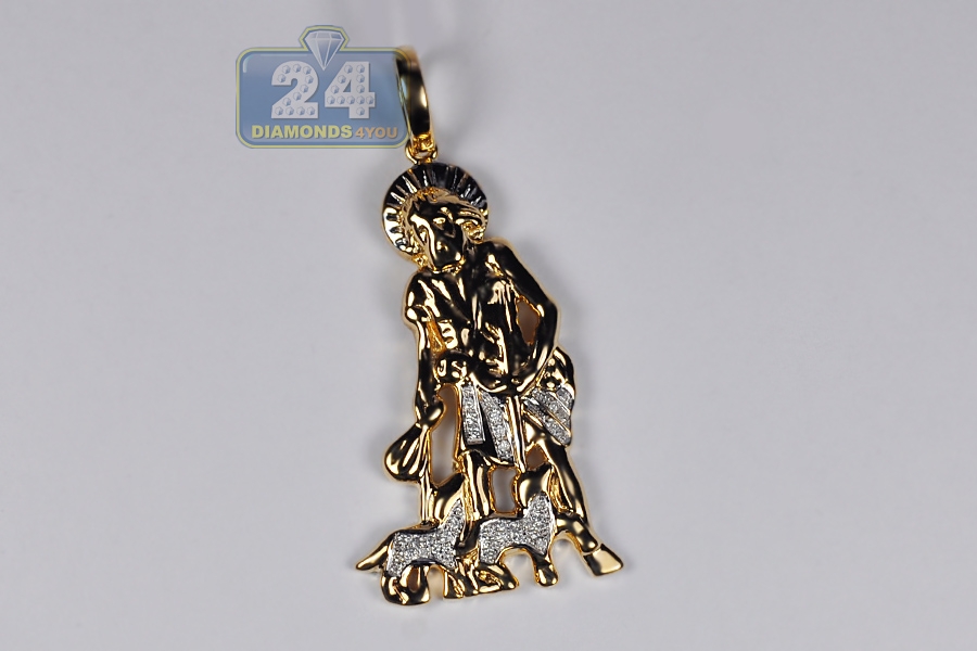 Our detailed Saint Lazarus pendant features a depicture of the poor man with the dogs came to lick his sores. Artfully crafted in affordable 10k yellow gold, it has high-polished smooth finish with white rhodium accents. The piece is also set with white round-cut natural diamonds, all totaling 0.14 carat. It has total length of 51 mm (without bail 40 mm) and width of 24 mm. The bail will perfectly fit a chain of up to 4 mm in thickness. This men's diamond pendant makes a pure religious statement!