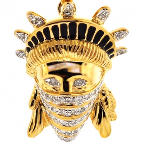 Be fierce and stylish with our Statue of Liberty gangsta pendant! It's professionally produced from affordable 10k yellow gold, and accented with black enamel inserts with glossy finish. This bandit style pendant features white round-cut genuine diamonds, all weighting 0.25 carat. The piece of jewelry measures 33 mm in hanging length, and the head is 25 x 18 mm. A necklace of up to 4 mm in thickness will fit the bail ideally. Unique design of men's diamond pendant stands out from the others!