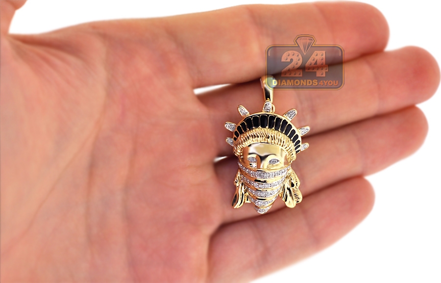Indulge yourself with a touch of daring and modern designs wearing this Statue of Liberty bandana pendant! It's beautifully made of 10k yellow gold, and polished to add smooth shiny look. The piece of jewelry also contrasts with black enamel accents. This gangsta pendant shimmers with 0.29 carat of white round-cut natural diamonds. The diamond Liberty pendant has total length of 37 mm, and the head is 30 x 23 mm. The bail is suitable for a 3 mm wide chain. Update your collection with men's diamond pendant!