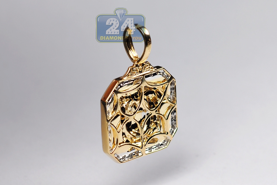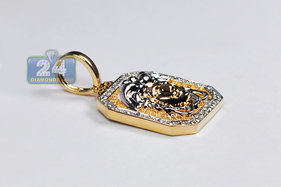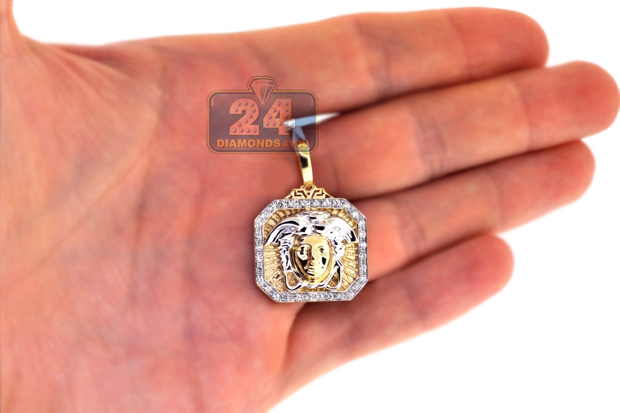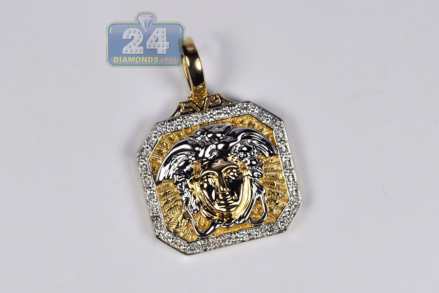 Designed in a rectangular shape, our diamond pendant represents Medusa, an ancient symbol that remains one of the most popular figures nowadays! Masterly manufactured from affordable 10k yellow gold, it has highly polished smooth finish with white rhodium accents. It's also accented with 0.47 carat of white round-cut natural diamonds. The piece features total length of 33 mm, and frame itself is 21 x 24 mm. The bail is suitable for a 4 mm necklace. This men's charm will add a glamorous touch to your look!