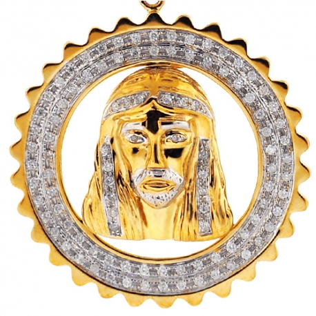 Jesus Christ head in diamond spiked frame pendant makes a truly unique religious statement! It's gorgeously created from affordable 10k yellow gold with a high-polished shiny finish. The Jesus pendant is amazed with 0.64 carat of lustrous white round-cut natural diamonds, I1-I2 clarity and H-I color. This men's diamond pendant measures 46 mm in hanging length, and the circle is 34 x 34 mm. Handsome addition to any jewelry collection!