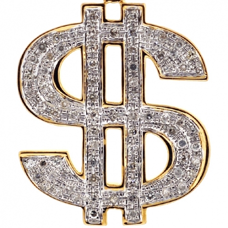 Our chic dollar sign pendant will never go out of style! Professionally made of hot 10k yellow gold, the piece is highly polished for brilliantly smooth shiny finish. This money pendant features 0.65 carat of white round-shaped natural diamonds. It also measures 40 mm in total length, and dollar sign is 29 x 25 mm. You may use up to 3.5 mm wide necklace to perfectly fit the bail. Get some fortune wearing this diamond pendant for men!