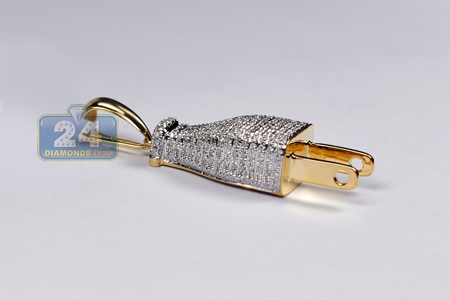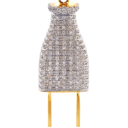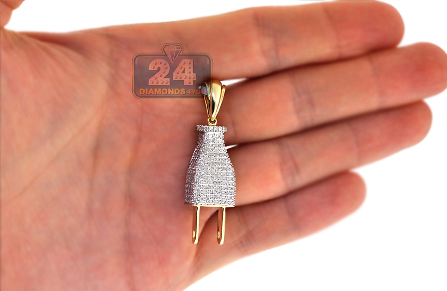 Your hustler spirit is represented by this gorgeous diamond plug pendant! Masterly made of affordable 10k yellow gold, it features high-polished sparkling finish with white rhodium accents. It's paved with 0.66 carat of white round-cut genuine diamonds. The jewelry has total length of 48 mm, and the plug is 34 x 14 mm. The bail can fit a necklace of 3 mm. Light up the night wearing men's plug necklace!