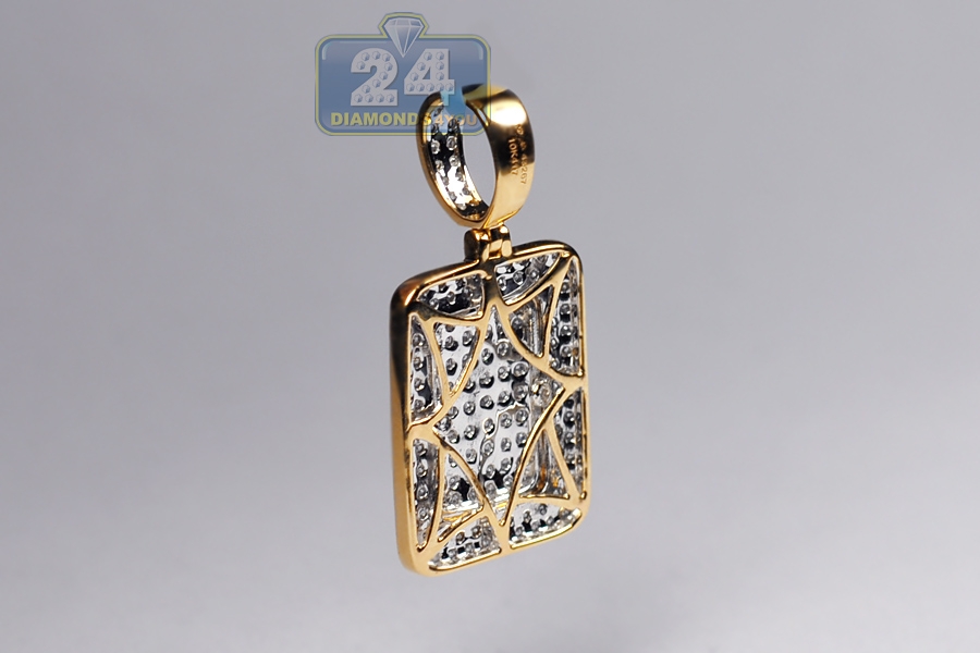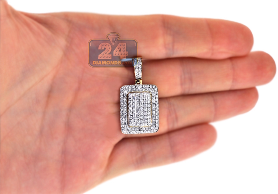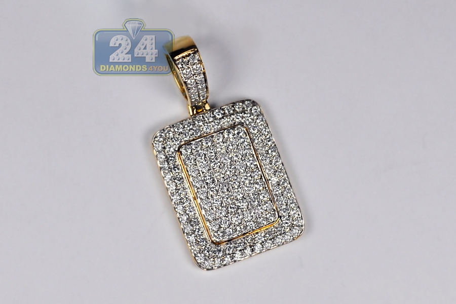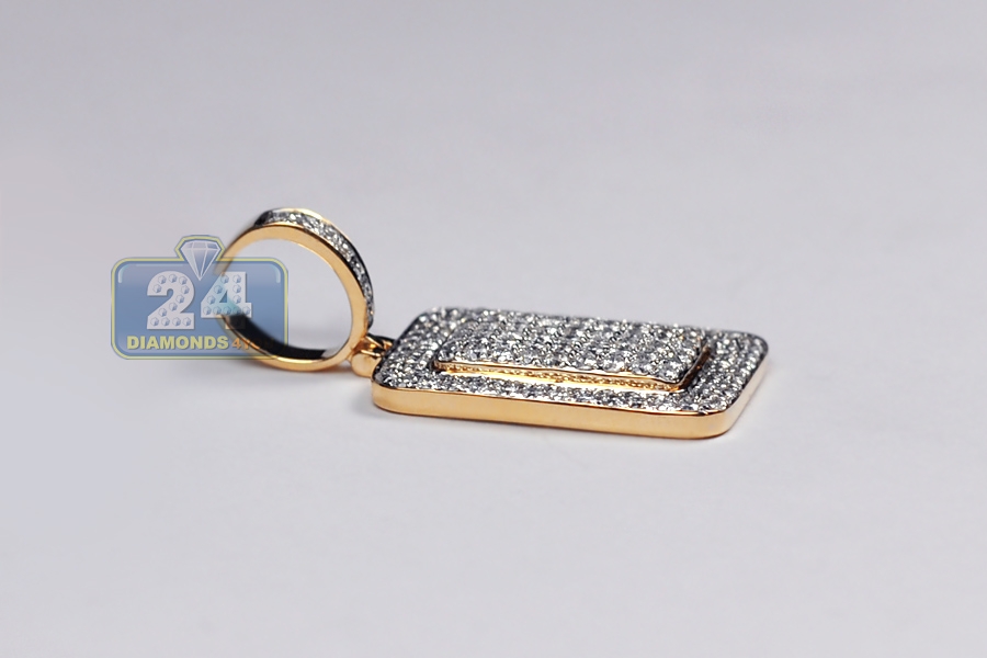 Our sparkling diamond pendant designed in dog tag style will get you noticed immediately! It's masterly made of warm 10k yellow gold with high-polished smooth finish. The piece is encrusted with icy white round brilliant-cut natural diamonds, all totaling 0.84 carat. It features total length of 35 mm, and plate itself is 22 x 18 mm. The bail can fit a 5.5 mm necklace. Be recognized wearing this men's iced out pendant!