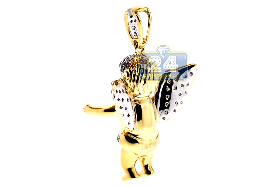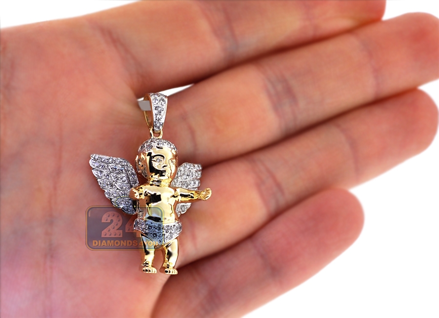 Here's a diamond baby angel pendant necklace with so much meaning! It's artfully created from warm 10 karat yellow gold, and precisely polished for ultra smooth touch. The angel pendant is encrusted with 0.93 carat of lustrous white round brilliant-cut genuine diamonds, SI1-SI2 clarity and G-H color. Our men's diamond pendant features 38 mm in height and 25 mm in width. Express yourself wearing diamond angel pendant!