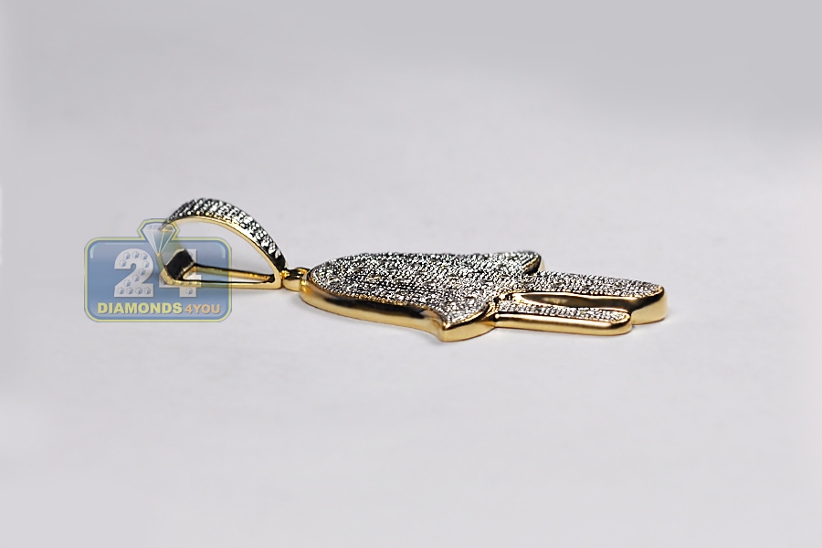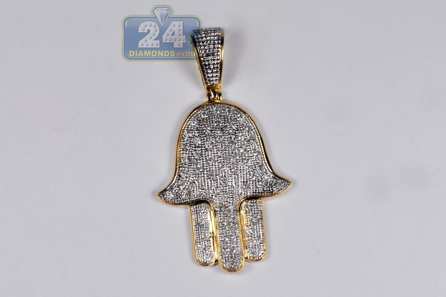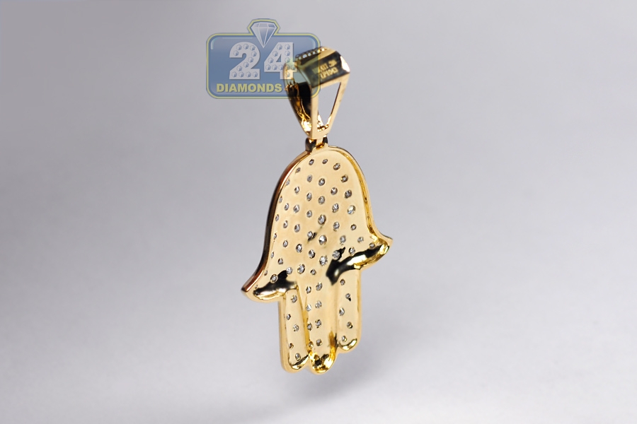 A classic symbol of divine protection against bad energies comes in our large Hamsa Hand pendant! Professionally made of warm 10 karat yellow gold, it is highly polished to have ultra-smooth shimmering look. This religious pendant for men is adorned with white round-cut natural diamonds, total weight 1.09 carat. The jewelry features 52 mm in dangling length, the hand itself is 36 x 28 mm. To perfectly fit the bail you can take a chain of up to 4 mm. Keep yourself safe wearing our men's Hamsa pendant!