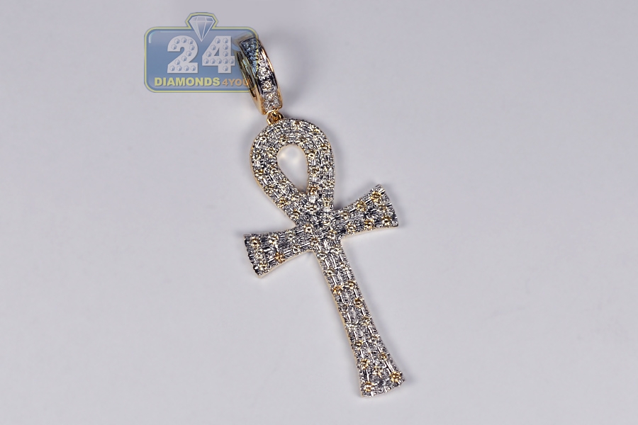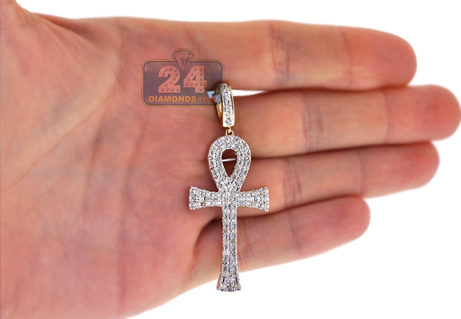 Our men's diamond ankh cross is an Egyptian symbol of eternal life! It's lovely created from affordable 10k yellow gold, and has highly-polished smooth finish with white rhodium accents for extra contrast. The piece is encrusted with 1.12 carat of white round-cut natural diamonds. It features 59 mm in total length (44 mm without bail) and 23 mm in width. The bail fits a chain of up to 5.5 mm in thickness. This men's loop pendant makes a stylish religious statement!