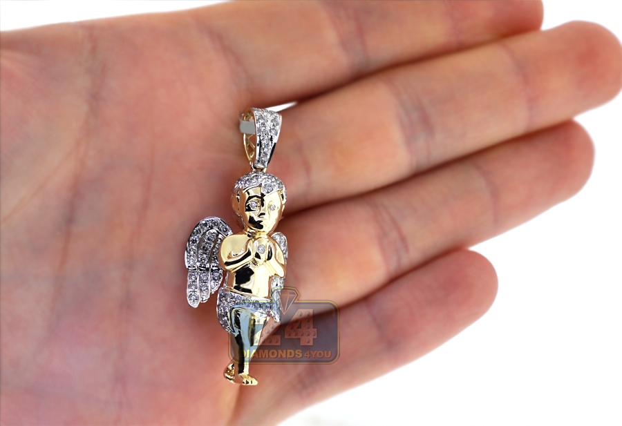 Get a touch of spiritual sparkle with this praying angel pendant! Expertly handmade of warm 10k yellow gold, it has highly polished shiny finish with bright white rhodium accents. The angel pendant is encrusted with 1.32 carat of gleaming white round brilliant-cut natural diamonds, SI1-SI2 clarity and G-H color. Our men's diamond pendant measures 47 mm in hanging length and 19 mm in width. Update your look wearing the tremendous diamond angel pendant!
