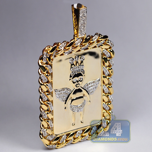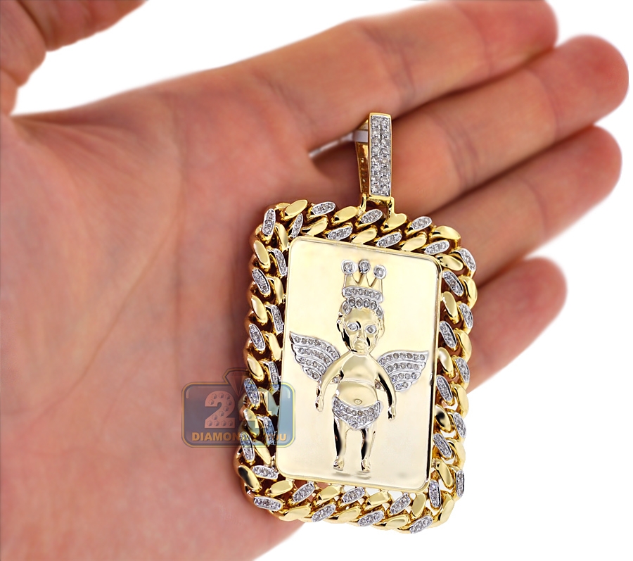 Bring sparkle and handsome style to your look with this men's diamond angel pendant! Professionally handmade of solid 10k yellow gold, it is accented with 1.81 carat of icy white round brilliant-cut genuine diamonds. This piece measures 75 mm in hanging length (58 mm without bail) and 46 mm in width. The diamond pendant is also framed in a well-known miami cuban chain that makes it a unique piece of jewelry!