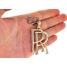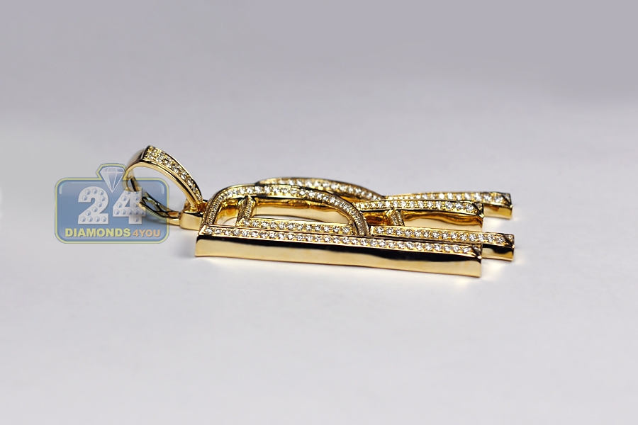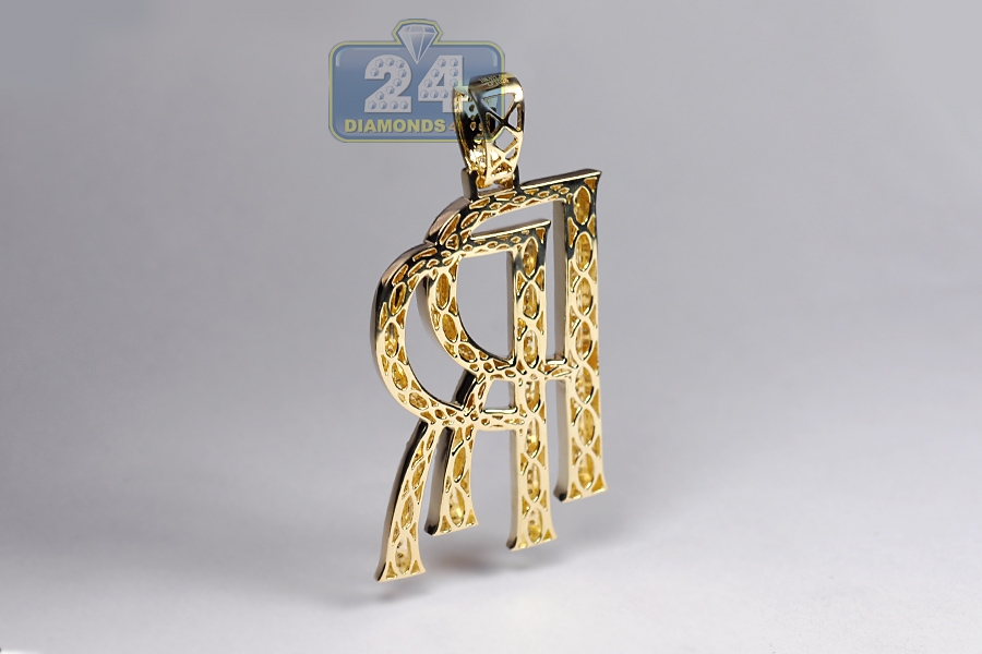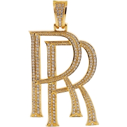 Change your look drastically wearing our luxurious Rolls Royce logo pendant! Skillfully handmade of hot 10 karat yellow gold, it features high-polished glossy finish. This men's custom-made pendant is studded with icy white round brilliant-cut genuine diamonds, all totaling 2.90 carats. Its hanging length is 63 mm, and "RR" measures 48 x 35 mm. Use a necklace of up to 4 mm in width to perfectly fit the bail. Our diamond Rolls Royce pendant will be a prime member in your jewelry collection!