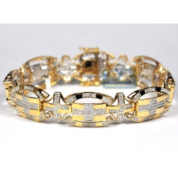 Look truly stylish wearing our diamond pave bracelet! Professionally made of warm 10 karat yellow gold, it features highly polished smooth finish with white rhodium accents. The links are paved with white round brilliant-cut natural diamonds weighting 3.67 carats. This men's diamond bracelet has length of 8.5 inches and width of 15 mm. The piece can be easily combined with many of your favorite outfits!