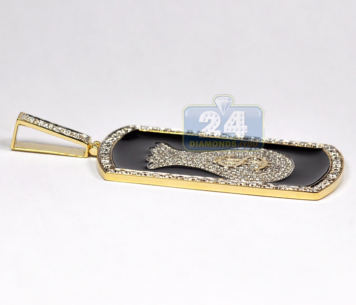 Are you looking for luck?! Our men's diamond money bag pendant is a right find! It is masterly produced from solid 10k yellow gold, and the front is beautifully covered with black enamel. The piece of jewelry is encrusted with 5.05 carats of icy white round brilliant-cut genuine diamonds. It measures 72 mm in total length (53 mm without bail) and 33 mm in width. This diamond pendant is an essential part of any jewelry collection!