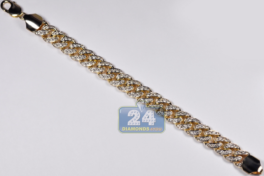 Bring lots of attention to your wrist wearing our breathtaking Miami Cuban link bracelet! It's masterly produced from solid 10k yellow gold with highly polished ultra-smooth finish. It is encrusted with 7.55 carats of white round brilliant-cut natural diamonds. The piece of jewelry features 8.75 inches in length, 13 mm in width and 4.5 mm in thickness. It is secured by a comfortable lobster claw clasp. This men's diamond bracelet adds a luxurious touch to any look!