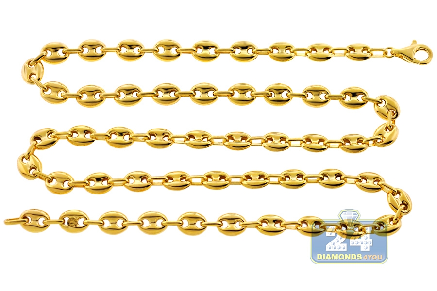 Our gold chain featured puffed anchor links is just waiting to sparkle on its own! Masterly created from warm 10k yellow gold, it's highly polished for brilliantly smooth finish. The necklace measures 7 mm in width, 2.5 mm in thickness, and available in 24, 26 or 30 inches in length. It's also secured with the safest lobster claw closure. This men's gold mariner necklace will enhance anything you wear!