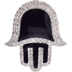 A recognizable sign of luck and good fortune, our Hamsa Hand pendant is a handsome choice for men! The piece of jewelry is professionally made of affordable 10k yellow gold, and partially covered with mysterious black enamel. It also features 0.46 carat of white round-cut natural diamonds. Size of the hand is 26 x 23 mm, and hanging length is 35 mm. You can use a chain of up to 2.5 mm in thickness to ideally fit the bail. Known as Hand of God, this men's religious pendant will brighten up your style!