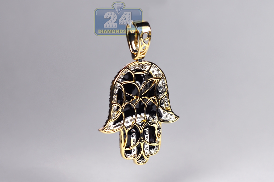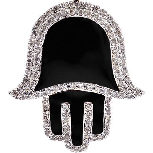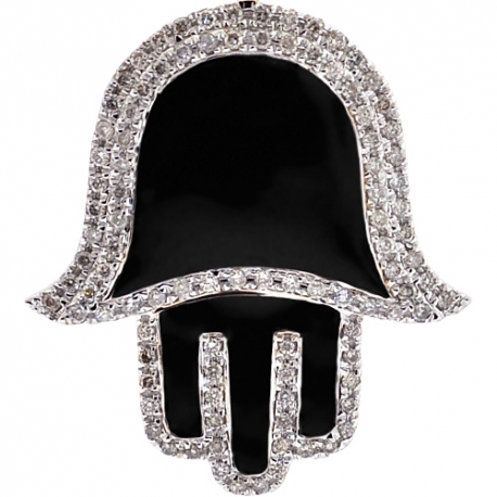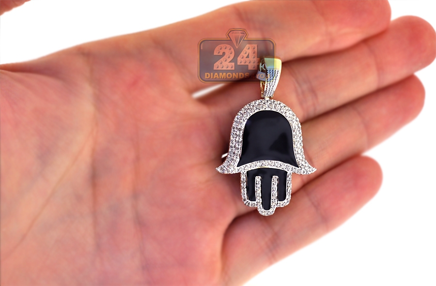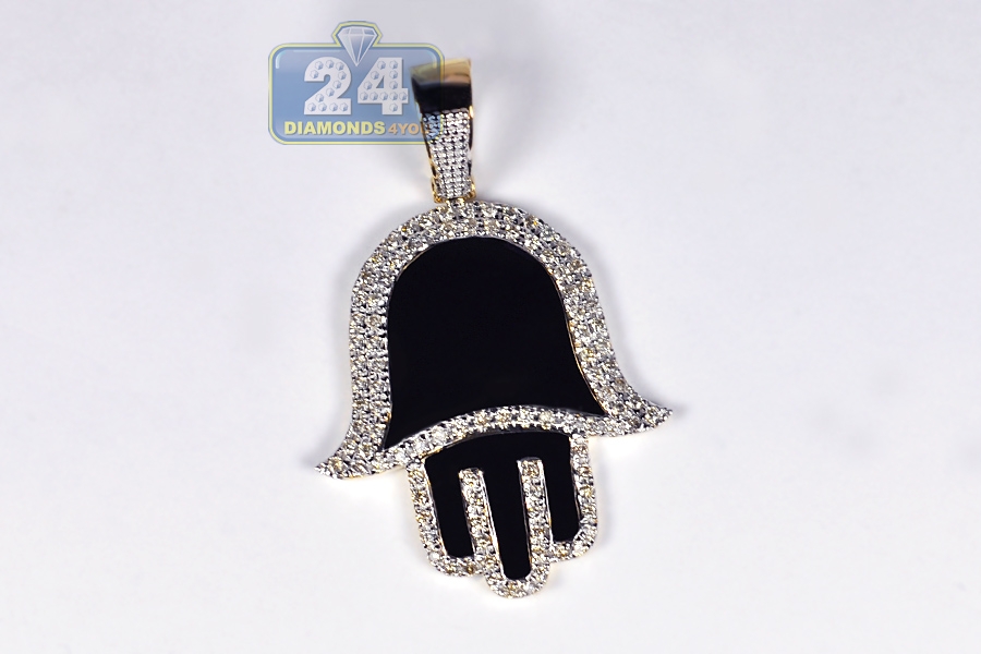 An all-time favorite symbol of protection, this diamond Hamsa pendant is a trendy variation! It's masterly manufactured from real 10k yellow gold with high-polished shiny finish, and accented with black enamel. Our religious pendant for men is studded with white round brilliant-cut natural diamonds of 0.80 carat. Its total length measures 44 mm, and the hand is 32 x 28 mm. The bail fits a necklace of 4 mm wide. Our diamond Hand of God pendant will bring you positive vibes!