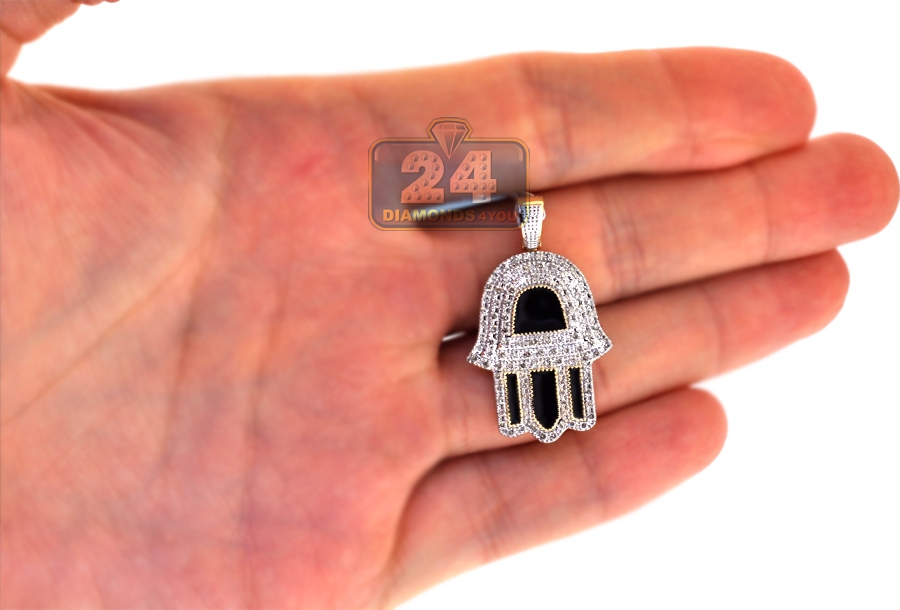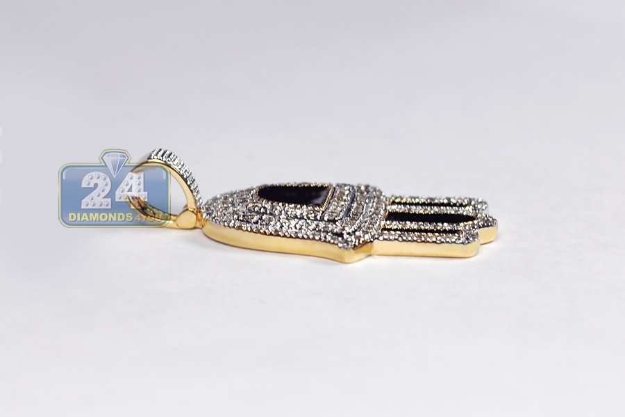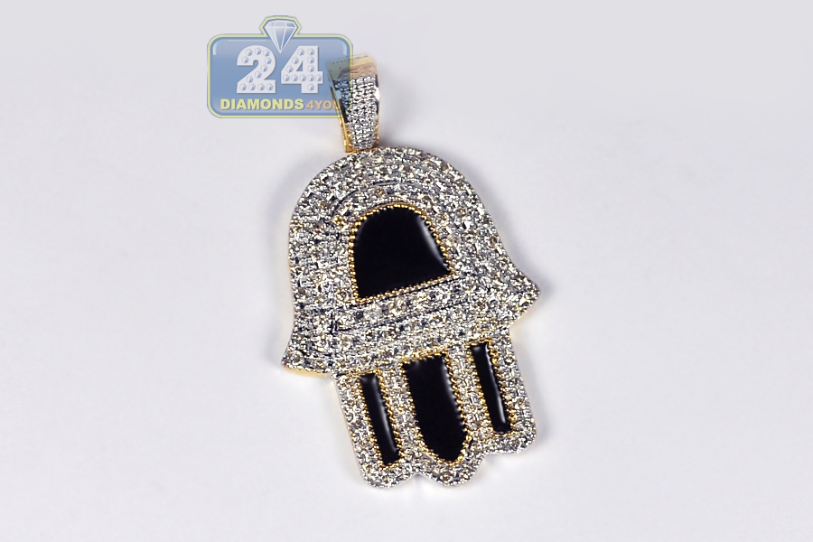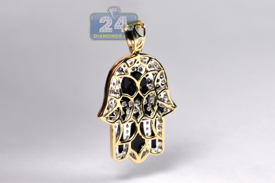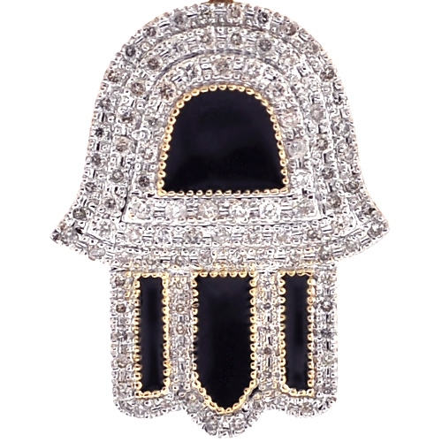 Add a worldly touch to your attire with our diamond Hamsa pendant! Professionally made of affordable 10 karat yellow gold, it has high-polished shimmering finish. This religious pendant for men also features black enamel accents for extra contrast. More than that it's set with white round-shape natural diamonds weighting 0.76 carat. The piece of jewelry measures 35 mm in total height, and the hand is 27 x 21 mm. The bail fits a necklace of up to 2 mm in thickness. This Hamsa Hand pendant is one the most recognized protective symbols!