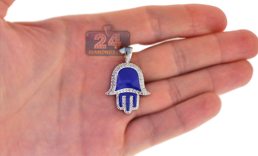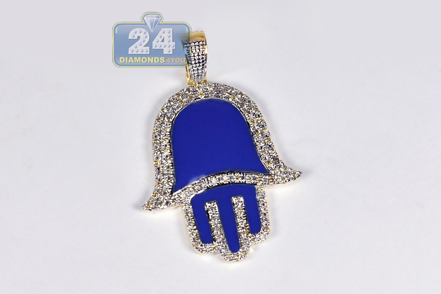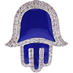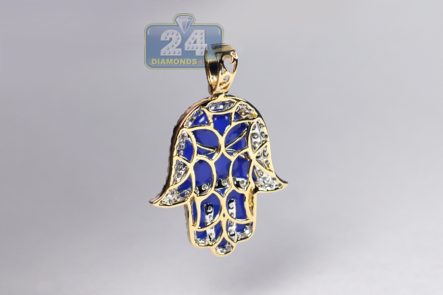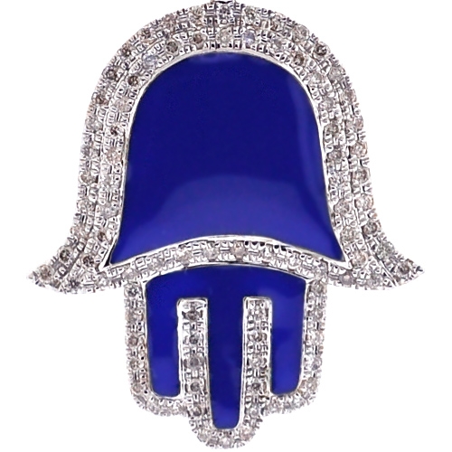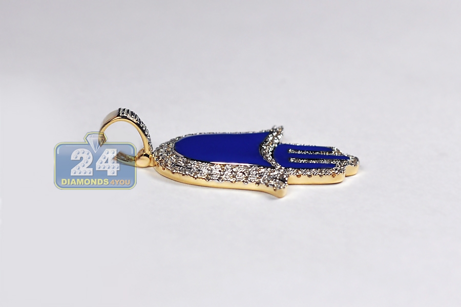 One of the most popular religious symbols, our diamond Hamsa Hand pendant is regarded as a protective sign! It's expertly manufactured from warm 10k yellow gold, and polished for very smooth shiny look. For bright contrast, it features breathtaking blue enamel inserts. This men's religious pendant is accented with white round-cut genuine diamonds of 0.46 carat. Total length of the piece measures 35 mm, and the hand is 26 x 23 mm. A necklace of up to 2.5 mm will fit the bail perfectly. Be protected against the evil eye with this Hand of God pendant for men!