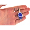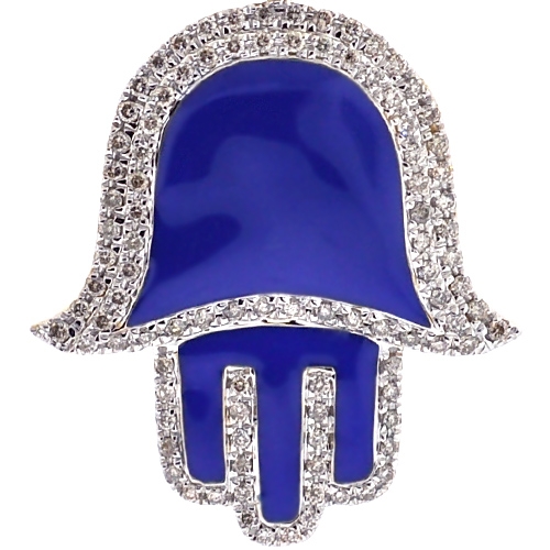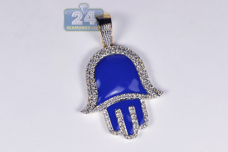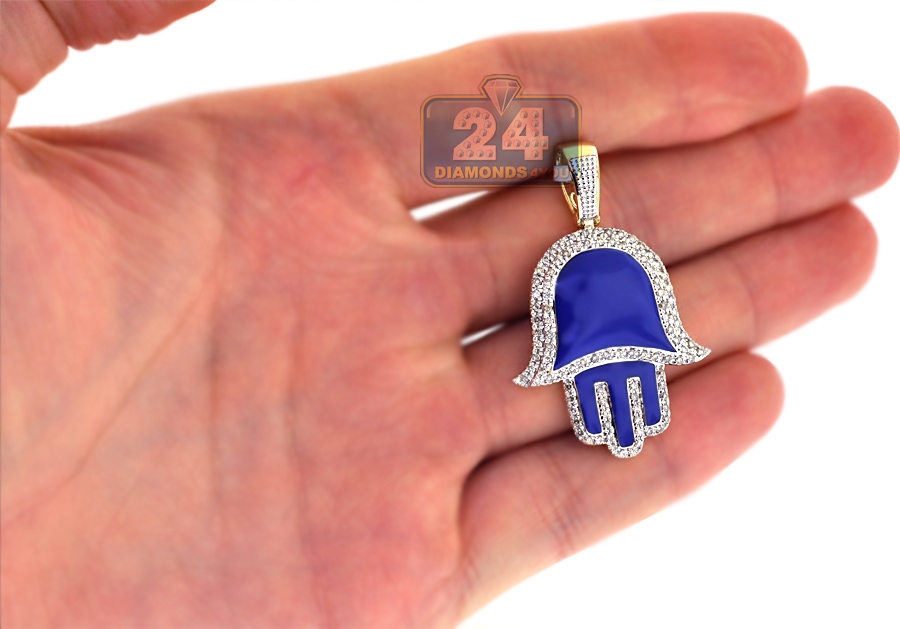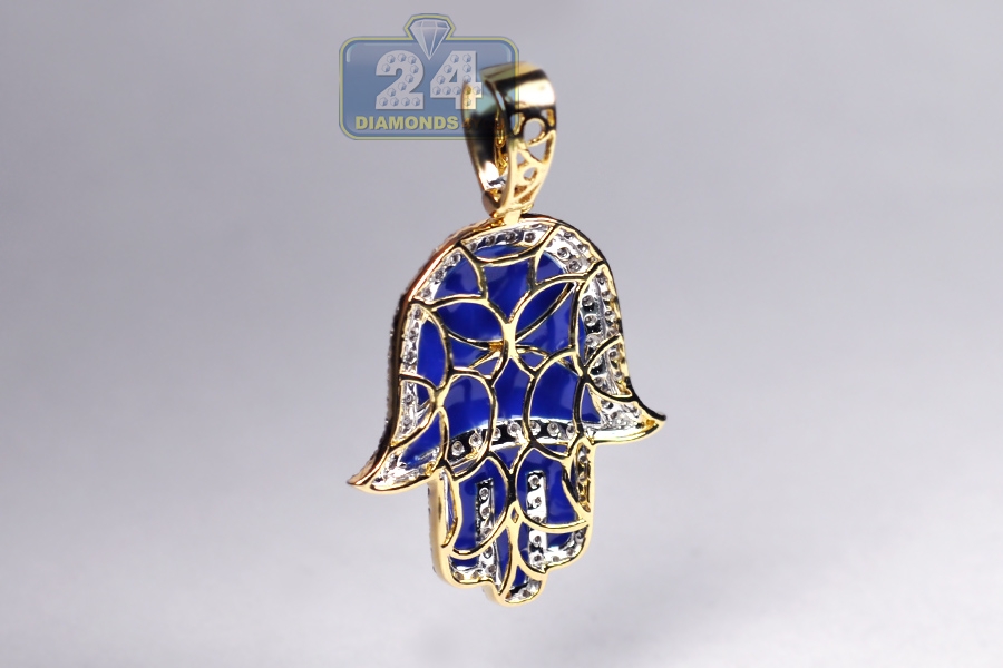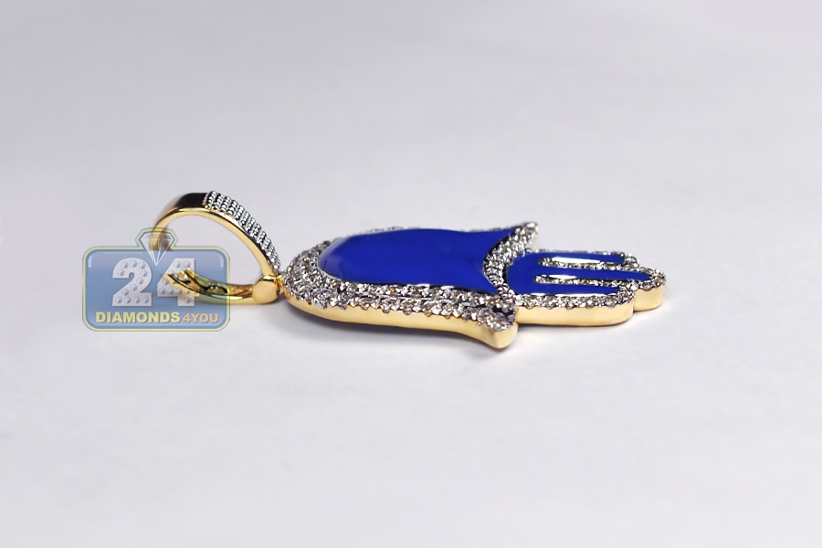 You're checking Hamsa Hand of God pendant, a shimmering version of the ancient protective amulet! Professionally created from warm 10 karat yellow gold, it's highly polished for a very glossy look. This men's religious pendant is also covered with blue enamel that adds a stylish touch. It contains 0.80 carat of white round brilliant-cut genuine diamonds. Dangling length of the piece is 44 mm, and the hand measures 32 x 28 mm. You can use a chain of 4 mm wide to fit the bail. Update your jewelry collection with this diamond pendant for men!