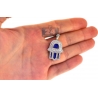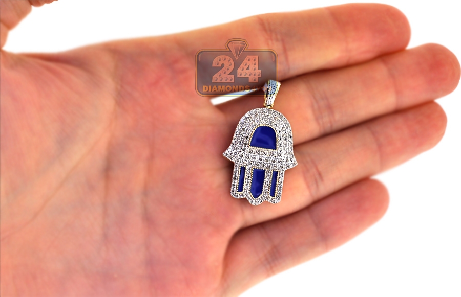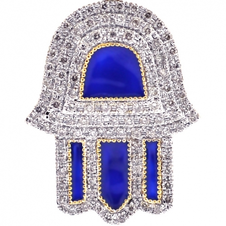 Exuding spiritual feel, our diamond Hamsa Hand pendant is a timeless piece of jewelry! Lovely crafted in hot 10 karat yellow gold, it features high-polished glossy finish with interesting blue enamel accents. This protective pendant for men is set with white round shaped natural diamonds of 0.76 carat. Its total length is 35 mm, and the hand measures 27 x 21 mm. The bail is suitable for a necklace of up to 2 mm wide. Wearing our men's Hamsa pendant, you will protect yourself from the evil eye!