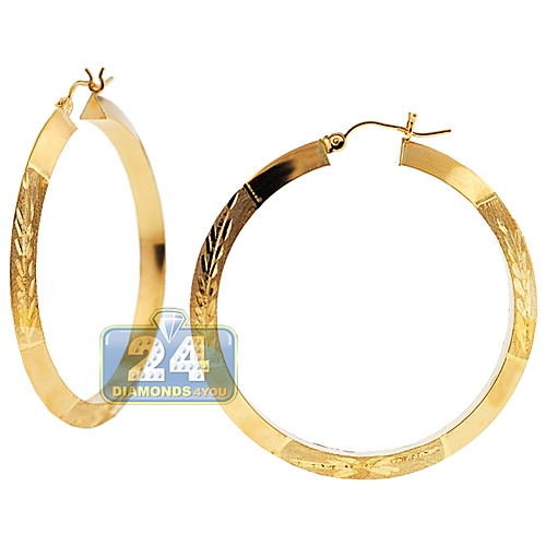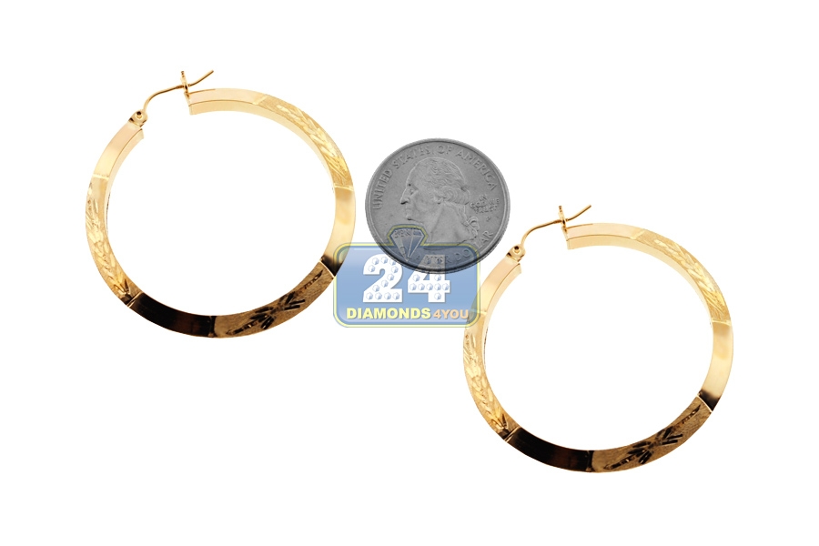 10K Yellow Gold Floral Pattern Hoop Earrings 4 mm 1 3/4 Inch