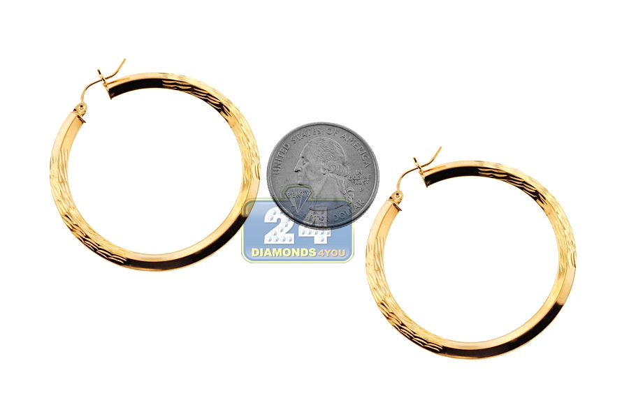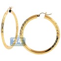 10K Yellow Gold Diamond Cut Pattern Hoop Earrings 3 mm 1 3/4 Inch