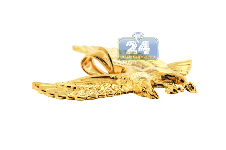 This gold eagle pendant is a perfect combination of beauty and lasting style! It's handmade of solid 10k yellow gold with highly polished sparkling finish. Men's gold pendant measures 35 mm in height and 47 mm in width. This eagle gold pendant makes a great addition to any jewelry collection and can be worn on any occasion!