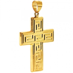 Our men's pendant offers stunning rendering of the classic religious symbol! Designed in puffed style, it is masterly created from 10k yellow gold, and high-polished for smooth shimmering. This large cross also features Greek Key motif that adds a unique detail to its look! To find an ideal match to this handsome charm, you may check our collection of gold chains.