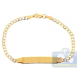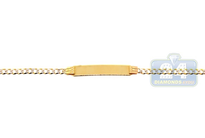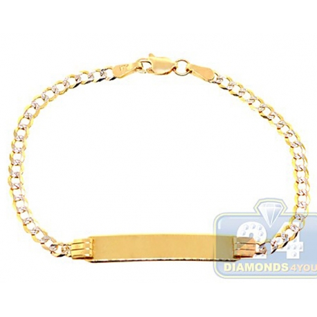 Impressive and elegant, our two tone child's ID bracelet is gleaming in warm 10k yellow gold with stunning diamond cut effect! What a fancy mix of colors that adds an extra charm and sophistication! The highly polished ID tab, which can be engraved with name, date of birth or other information, is linked to a smooth and slim concave curb links with white gold plating. Make your child happy and smiling with such an amazing accessory!