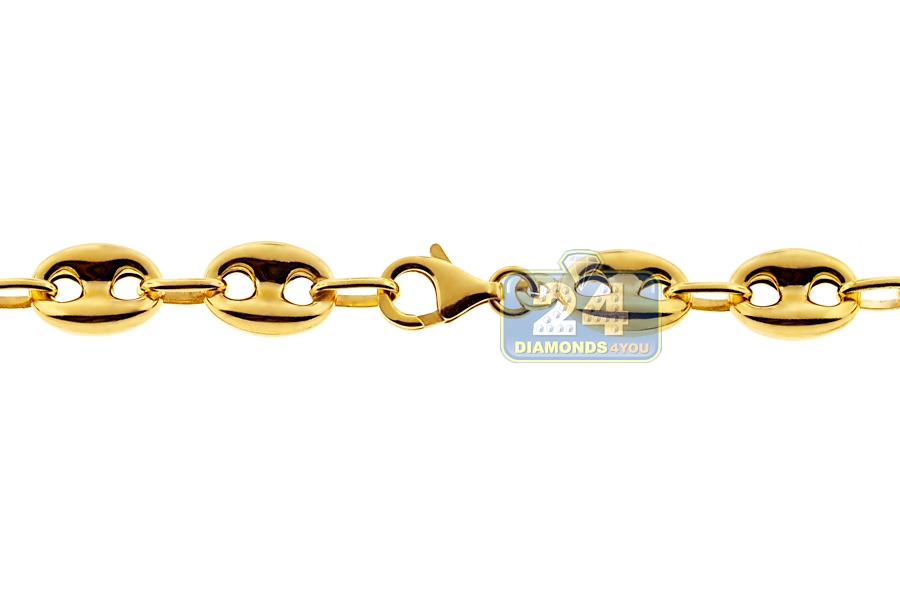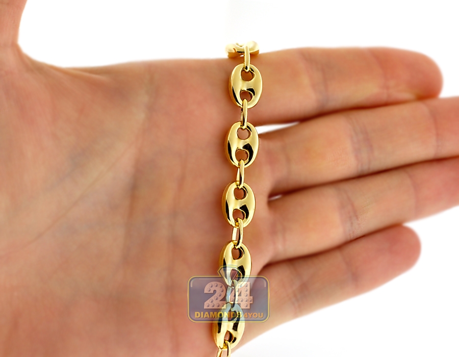 Designed in magnificent hollow style, this puffed mariner link chain is the perfect finishing touch to both your business and casual dress! The real gold necklace is expertly handmade of warm 10 karat yellow gold, and has brightly polished finish. This men's gold chain measures 9 mm in width and available in 24, 26, 28 or 30 inches in length. Our gold mariner link chain has handsome look you will turn to time after time!