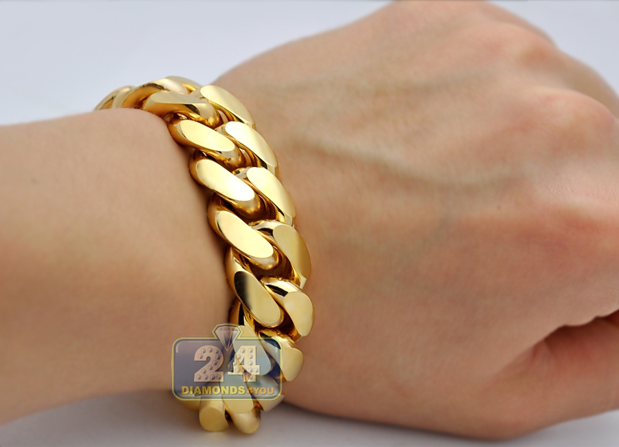 This custom-made miami cuban link bracelet is the unique piece! It is handmade of solid 10k yellow gold, and has ultra smooth finish. The bracelet measures 9 inches in length, 18 mm in width and approximately 185.1 grams in weight. Show yourself as the handsome and sophisticated individual you are with this stunning miami cuban link bracelet!
