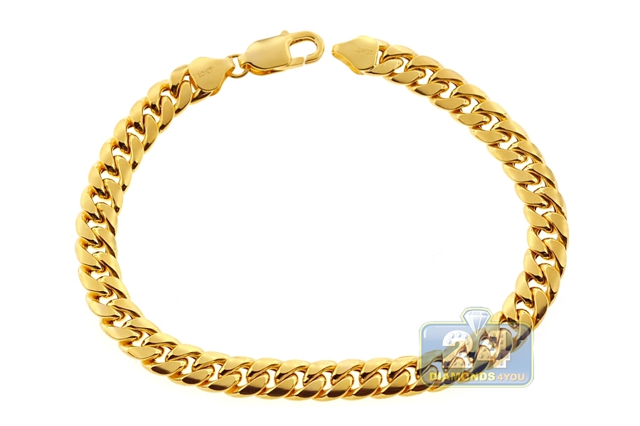 Highly polished to gleaming shine, these classic Miami Cuban hollow links form a handsome bracelet! It's beautifully crafted from 10k yellow gold. This wrist bracelet features 9 inches in length, 7.5 mm in width and approximately 11.6 grams in weigh. Our men's gold bracelet is secured by user friendly lobster claw. This versatile gold bracelet is comfortable for everyday wear!