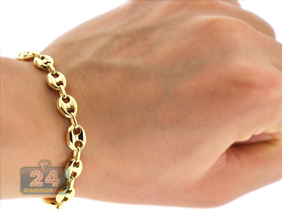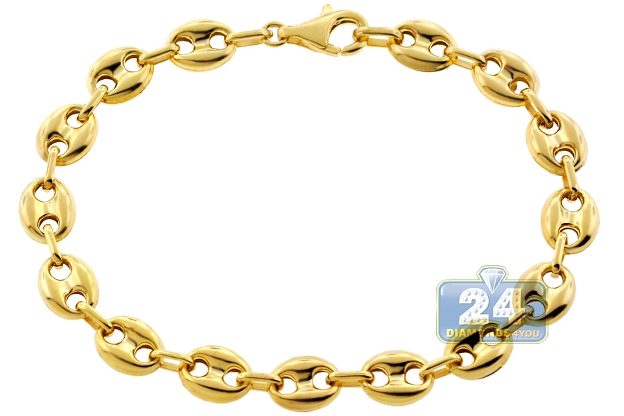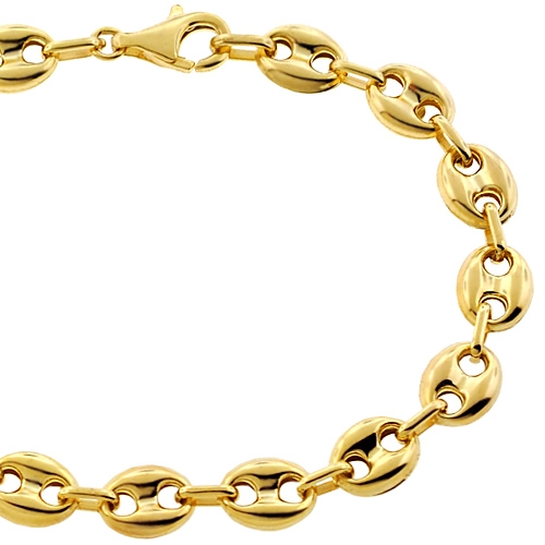 Our stunning men's wrist bracelet featured mariner links will spark up any conversation! Masterly produced from warm 10k yellow gold, it has highly polished finish for smooth touch. It measures 3 mm in thickness, 8 mm in width and 8.25 inches in length. Closed with a secure lobster claw clasp, this puffed anchor bracelet has a good chance to become your favorite piece of jewelry!