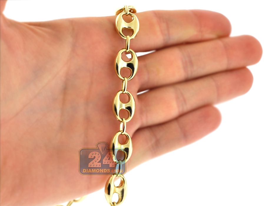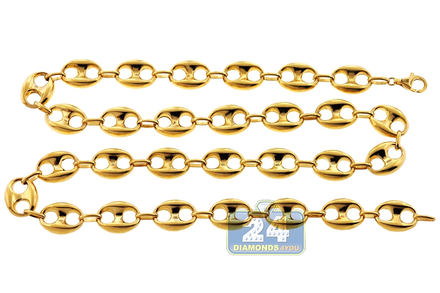 Our men's anchor chain featured puffed links works nicely as a standalone statement! Professionally made of lustrous 10k yellow gold, it has high-polished shiny finish! The real yellow gold chain measures 4.5 mm in thickness, 12 mm in width, and available in 24, 26 or 30 inches in length. It is also closed by a user-friendly lobster claw clasp. With this gold mariner necklace, you will always feel well-dressed!