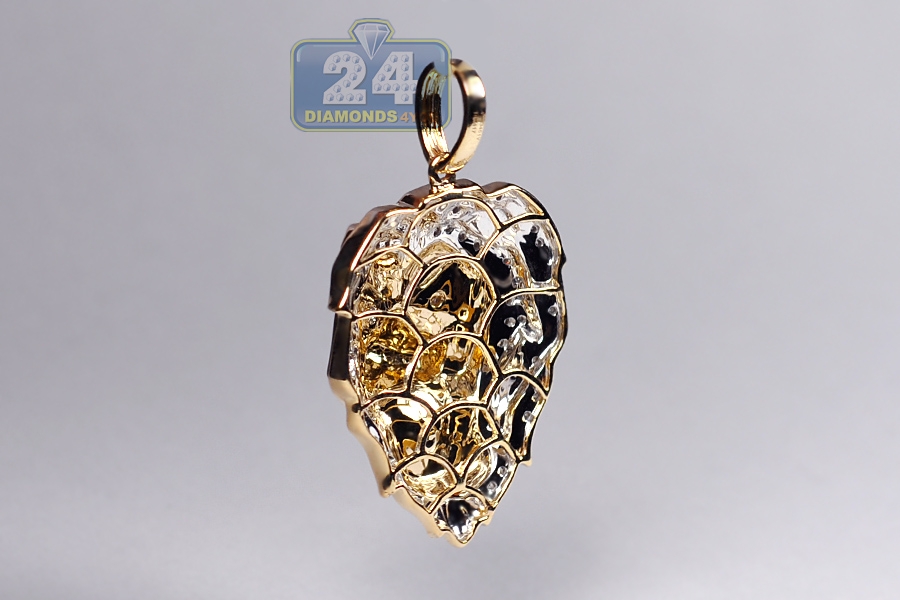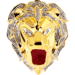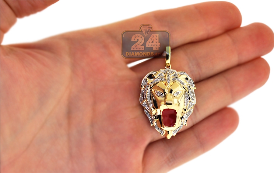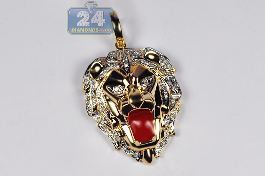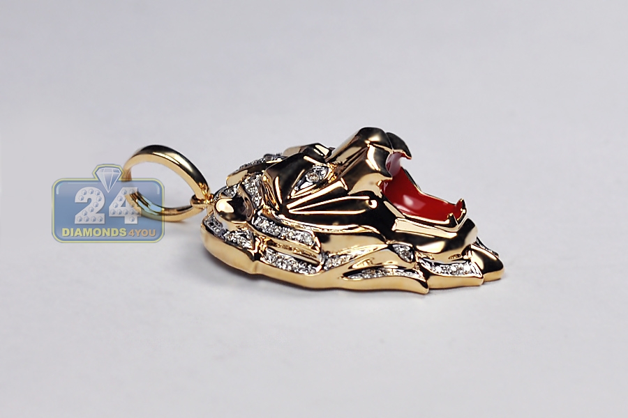 Our lion head pendant may look furious but is sure not to bite! It's lovely crafted in warm 10k yellow gold, and high-polished for ultra-smooth sparkling finish. To add a unique detail, the mouth is covered with bright red enamel. The head of the lion is accented with 0.34 carat of white round-cut natural diamonds. Hanging length of the piece is 43 mm, and the head itself is 32 x 26 mm. The bail fits a chain of 4 mm wide. This men's diamond pendant is more luxurious than wild!