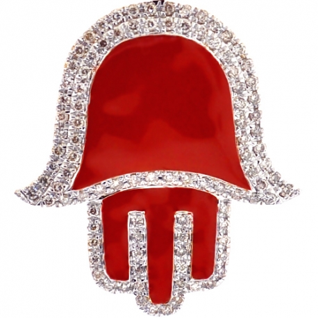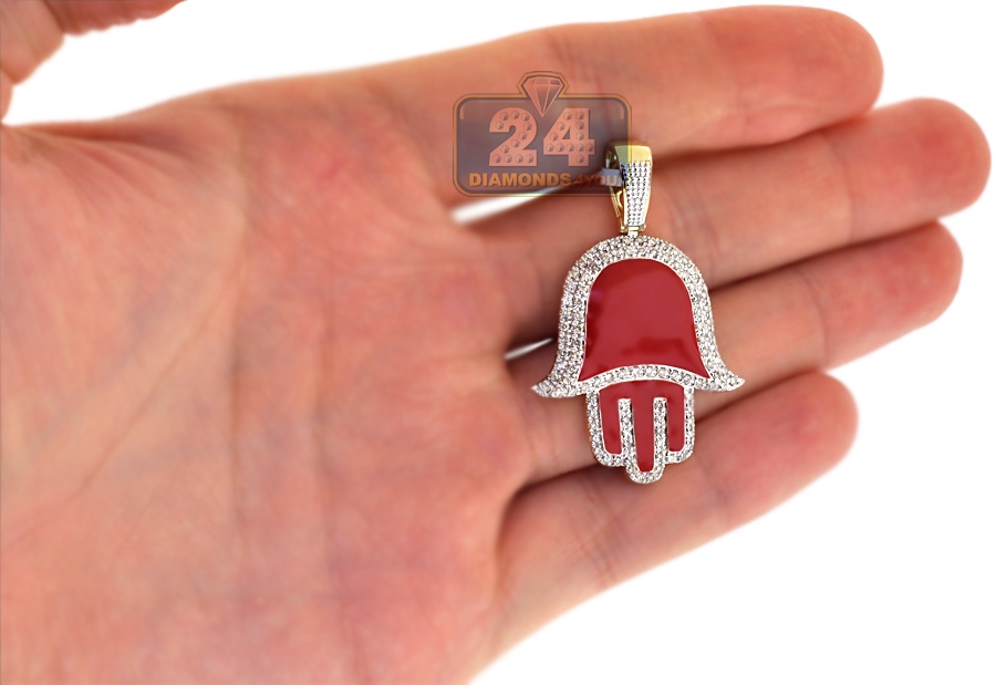 Charming design of this diamond Hamsa Hand pendant brings the spiritual amulet to a new modern level! It is expertly produced from real 10 karat yellow gold, and partially covered with bright red enamel. The metal is highly polished for ultra-smooth finish. Our religious pendant for men is amazed with 0.80 carat of white round brilliant-cut natural diamonds. It also features 44 mm in hanging length, and the hand itself is 32 x 28 mm. The bail is suitable for a chain of up to 4 mm wide. Choose this men's diamond pendant, and you will be protected against negative energy!