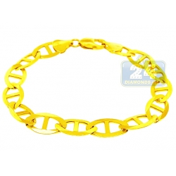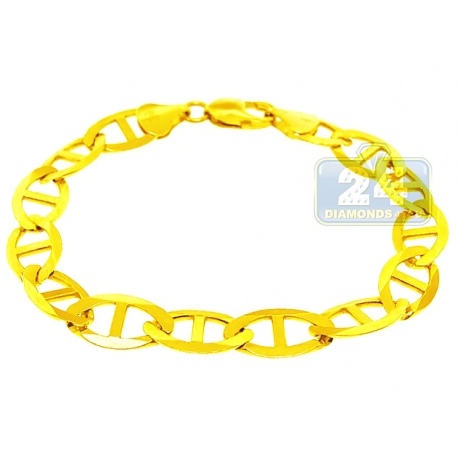 Treat your man right with our gold Mariner bracelet! Artfully manufactured from hot 10 karat yellow gold, it features highly polished ultra-sparkling look. This men's gold bracelet has length of 9.5 inches, width of 11 mm and weight of 20.3 grams. It's secured by comfortable lobster closure. The Anchor link bracelet is an eye-catching accessory for any classy wardrobe!
