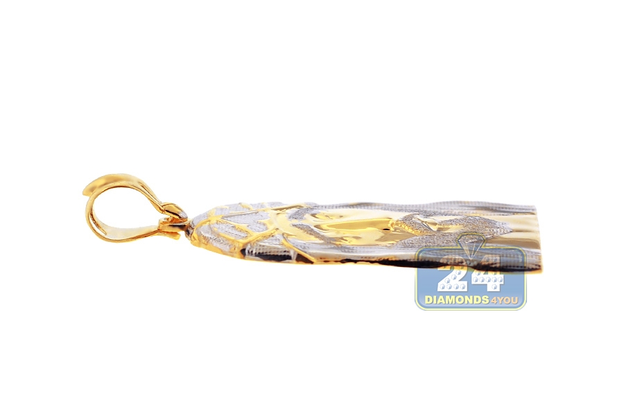 This Jesus Christ face pendant is a perfect way to make a statement about your faith! It is expertly handmade of solid 10k yellow gold, and has white rhodium pattern for brilliant shine. Our men's religious pendant measures 62 mm in dangling length and 36 mm in width; its bail fits maximum 6 mm chain. Show your devotion with this gorgeous religious pendant!