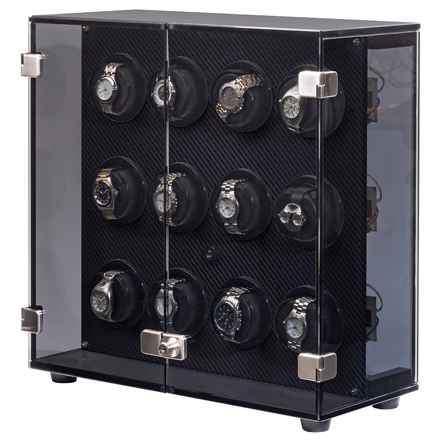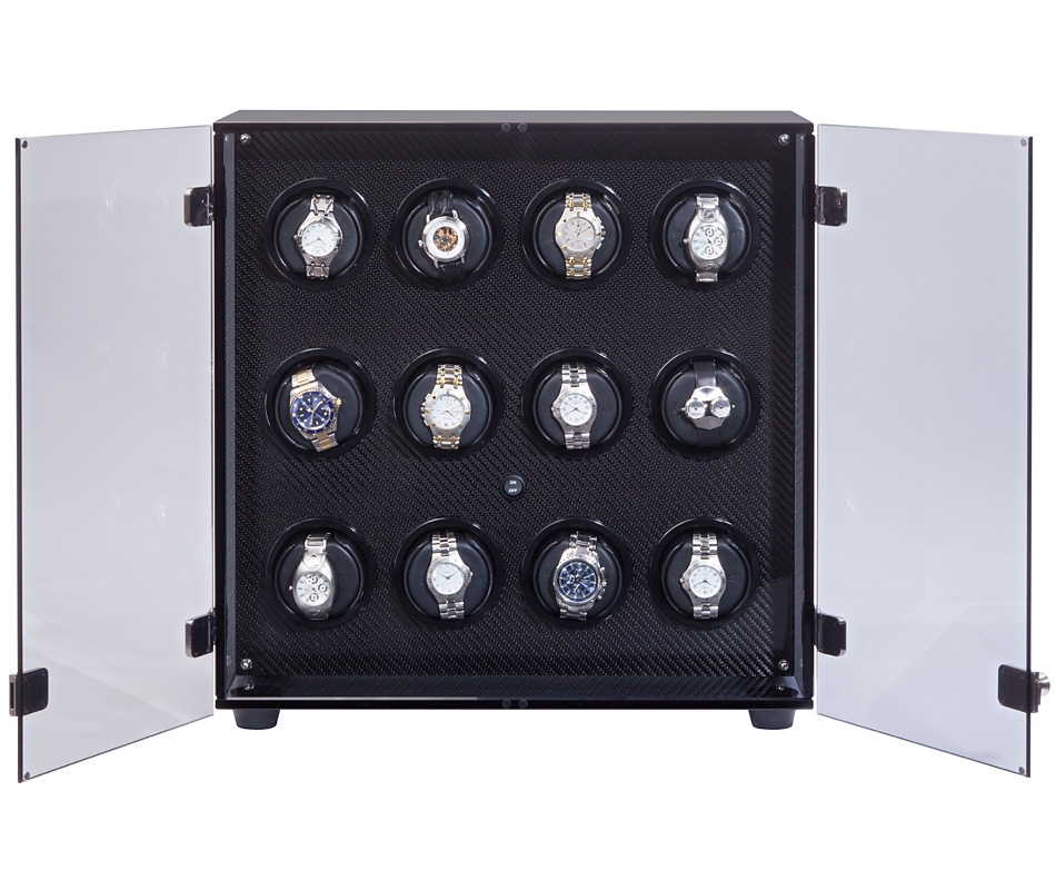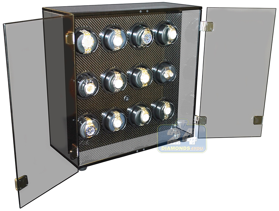 Here is an absolutely new watch winder cabinet W60139 from Milano collection designed by Orbita Corporation. It's created to simultaneously wind up to twelve automatic timepieces. This machine uses patented winding technology that ideally mimics the natural movement of the wrist. That can be described as a series of oscillations triggered by a single revolution every 10 or 15 minutes. The case is made of 10 mm thick smoked, tempered glass as well as 6 mm thick glass doors; the faceplate features magnificent carbon fiber. This unit is powered by AC adapter. If you buy from 24diamonds.com - official dealer of the brand, and you get 1-year factory warranty as well as professional after-warranty service.