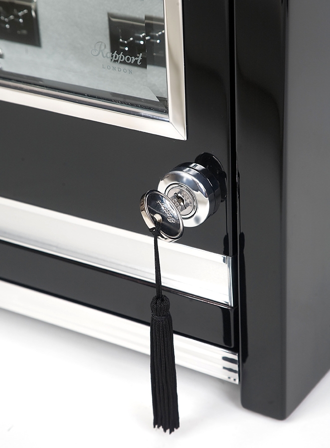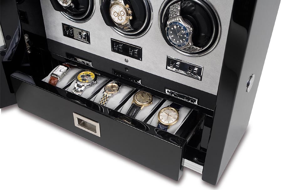 Latest winding technology solutions and contemporary design are combined in this twelve automatic watch winder cabinet W512, a part of Paramount series designed by Rapport London. The case is artfully created from solid ebony wood with eight layers of high-gloss lacquer. It is fitted with beveled hinged glass door that can be locked. Bright chrome plated brass hardware completes a luxurious look of the box. The interior is lined with soft gray velvet, and illuminated with bright LED light. There is also a pull-out drawer with individual compartments for keeping extra timepieces. Each of twelve watch cups is covered with black leather, and has adjustable soft clip that accommodates any length of watch band. Motor mechanism works very quietly. It offers multiple winding programs including 2 speed rotation options (1130-1690 or 3960 turns per day) as well as 3 direction rotation modes (clockwise, counter-clockwise or bi-directional). The device is powered by AC adapter, and has an optional battery slot. It measures 29.1 inches in height, 17.3 inches in width and 7.1 inches in depth. If you're dreaming to wind and display your watch collection in pure amazing way, choose this winding machine! We're an official dealer of the brand. So you get factory warranty and free domestic shipping for this item.