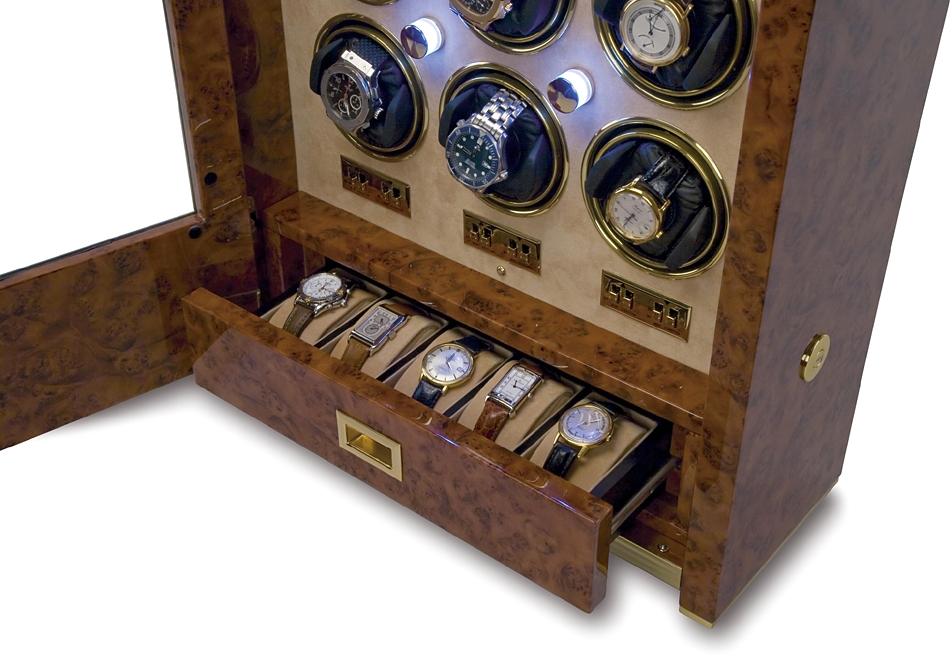 For the enthusiasts who appreciate finest quality, twelve automatic watch winder cabinet W532 comes from Paramount collection designed by Rapport London. The case is masterly manufactured from solid aged walnut wood with eight layers of high-gloss lacquer. It is fitted with beveled hinged glass door that can be locked. Bright gold plated brass hardware completes a luxurious look of the box. The interior is lined with soft beige velvet, and illuminated with bright LED light. There is also a pull-out drawer with individual compartments for keeping extra five timepieces. Each of 12 watch cups is covered with black leather, and has adjustable soft clip that accommodates any length of watch band. Motor mechanism works very quietly. It offers multiple winding programs including 2 speed rotation options (1130-1690 or 3960 turns per day) as well as 3 direction rotation modes (clockwise, counter-clockwise or bi-directional). The device is powered by AC adapter, and has an optional battery slot. It measures 17.3 inches in width, 29.1 inches in height and 7.1 inches in depth. If you're dreaming to wind and display your watch collection in chic way, choose this winding machine! We're an official dealer of the brand. So you get factory warranty and free domestic shipping for this item.