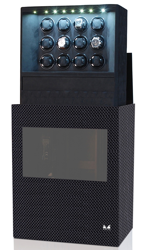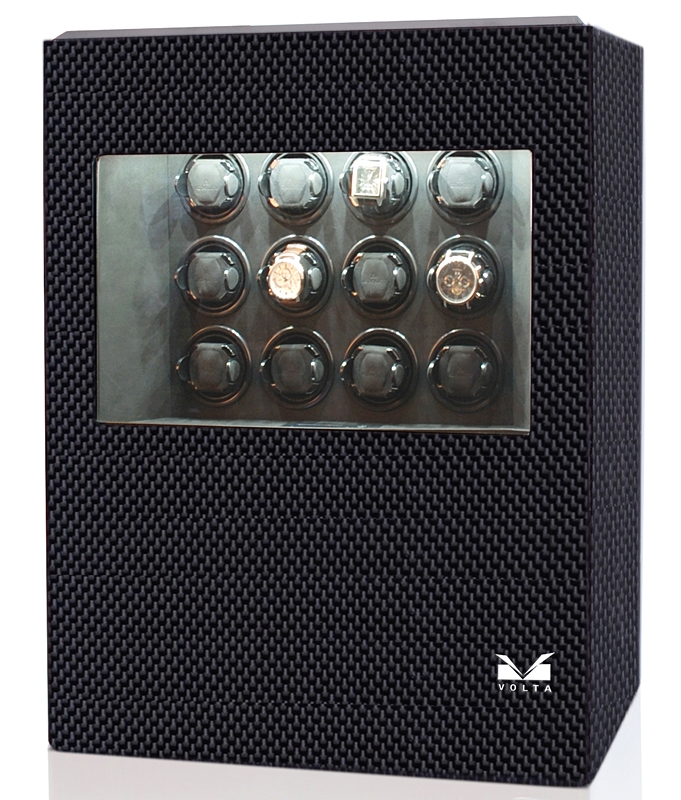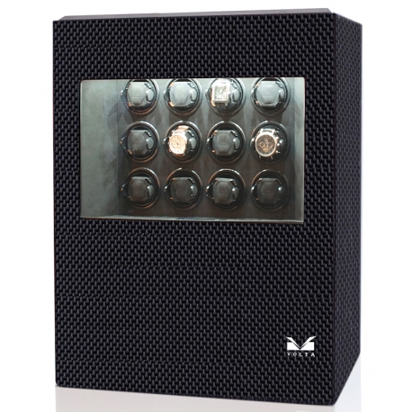 Volta 31-570121 is winder cabinet for twelve automatic watches, from Roadster collection, produced by Volta. The case features high-gloss carbon fiber finish, and soft gray microfiber suede interior. This is newly designed model that has auto-rise function. You may simply press a button on the supplied remote and the entire winding module rises out of the case for easy access. When you finish to choose a timepiece, the unit can be easily vanished. Beautiful inside view is brightened by white LED lights. Each of twelve mounts is equipped with its own high-quality quiet Japanese Mabuchi motor that are power by AC adapter. There is LCD screen inside to control the motors. You may select a clockwise, counterclockwise setting, or a combination of both revolutions. More than that you are able to select speed of 650, 900, 1350, or 1800 turns per day, so you will definitely find the right setting for specific watch. This winder also features speed winding and sleep mode options. Select speed winding when watch has completely died, and it needs to be wound quickly. The sleep mode allows to mimic normal day-to-day wear as the winder will not work for a period of up to 16 hours per day. Buy online at 24diamonds.com, official dealer of Volta brand. And you will get a year of factory warranty as well as professional after-warranty service.